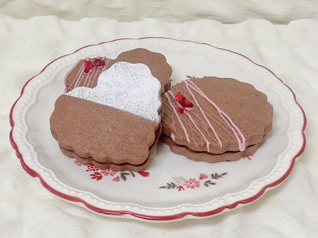 生チョコサンドクッキー🎶フランボワーズで甘酸っぱくしたよ〜ん😍👌❣️途中なんかナイトルーティンのバケモノが通り過ぎていった気がしたけど…💦